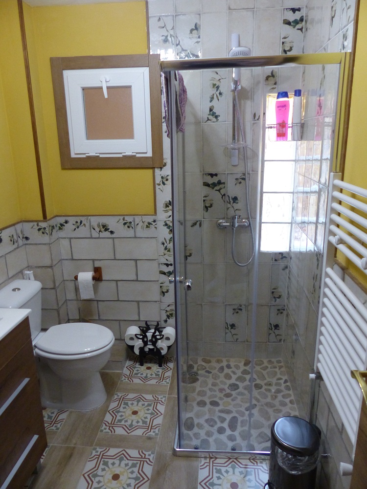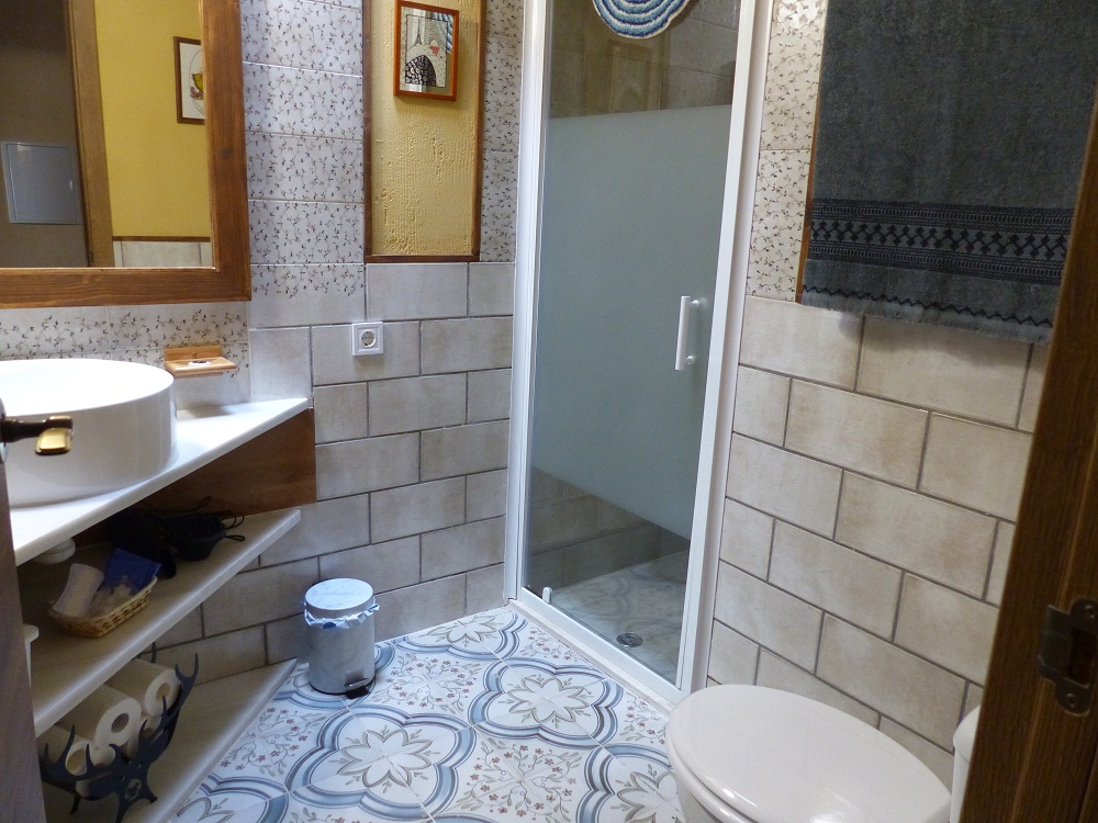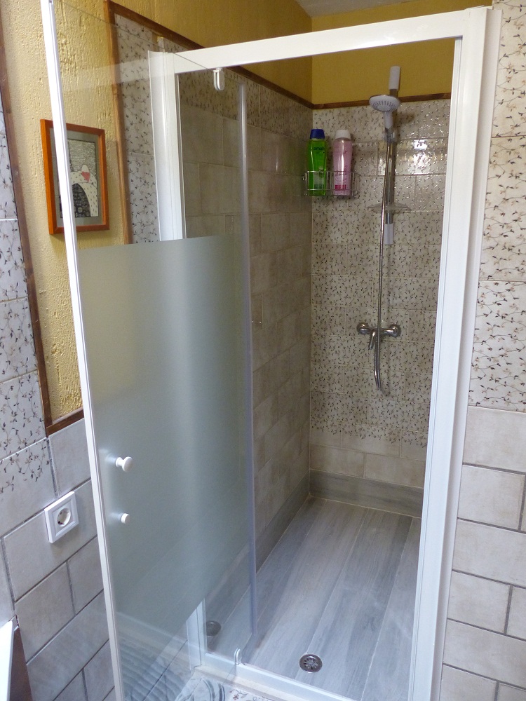 Ducha, secador de pelo, gel, champú, jabón y botiquín.