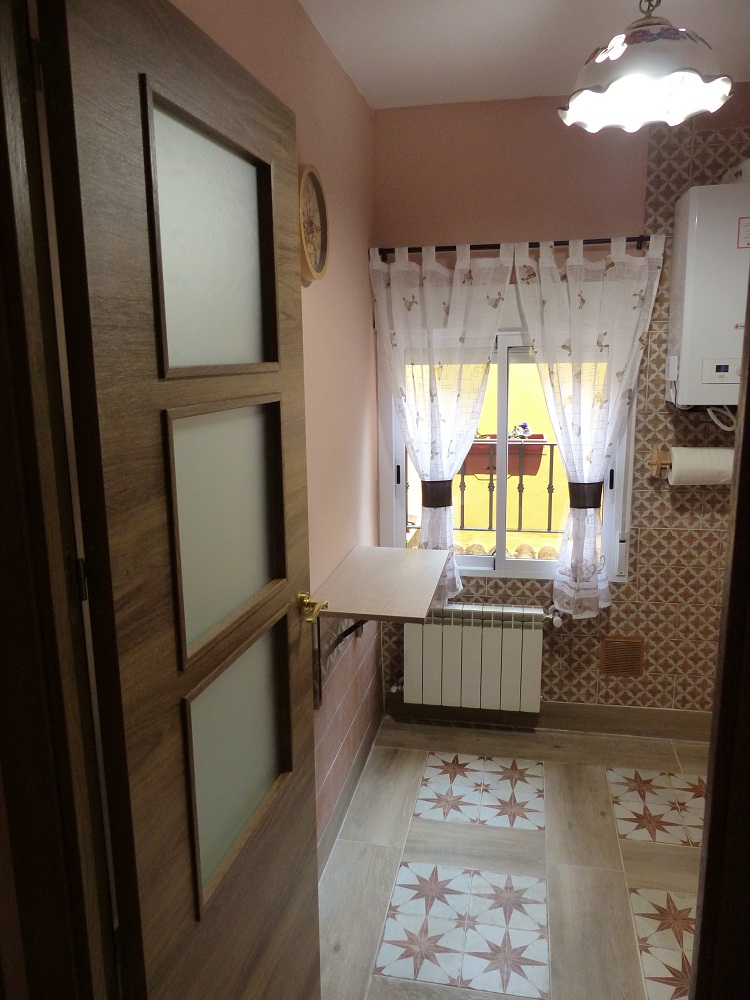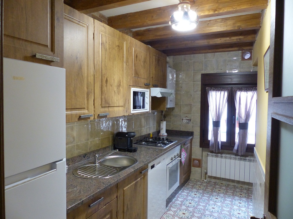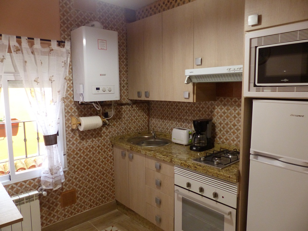Nevera, congelador, microondas, horno, lavavajillas, cafetera, tostadora, fuegos de gas, vajilla completa, cubiertos, sartenes, olla, cazo, paellera, batidora y artículos de limpieza.