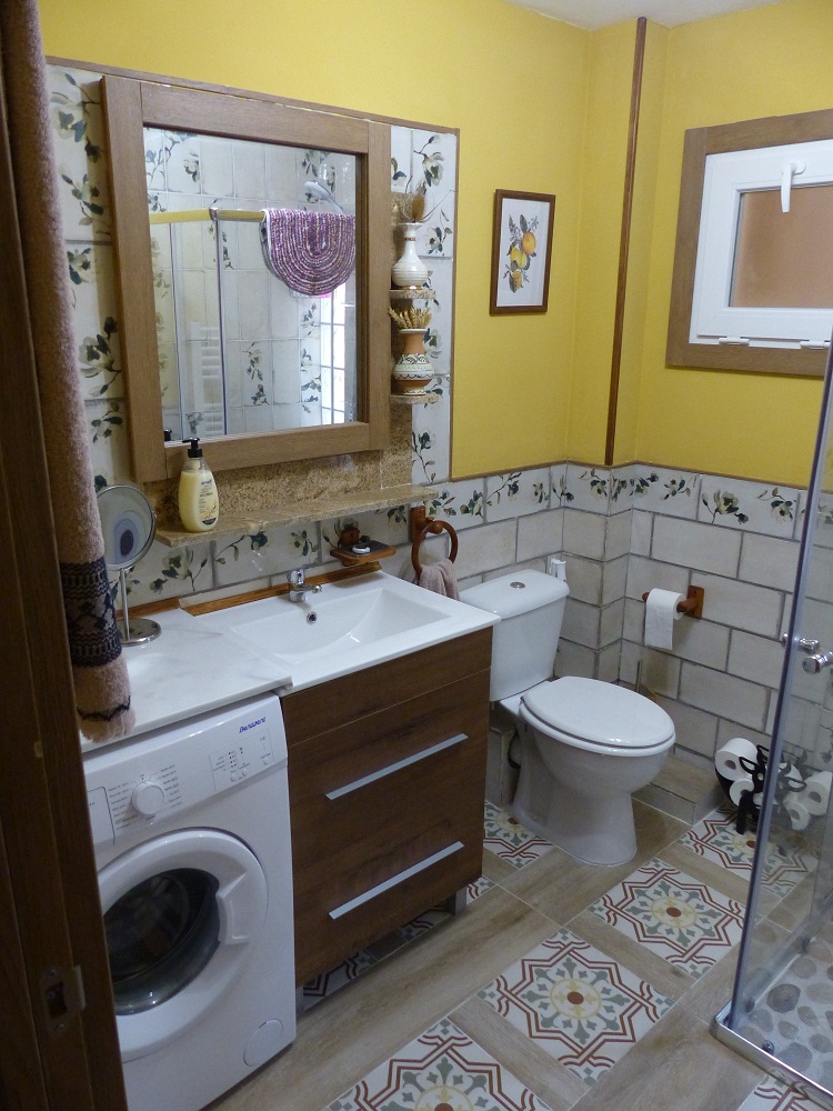 Ducha, secador de pelo, gel, champú, jabón y lavadora.